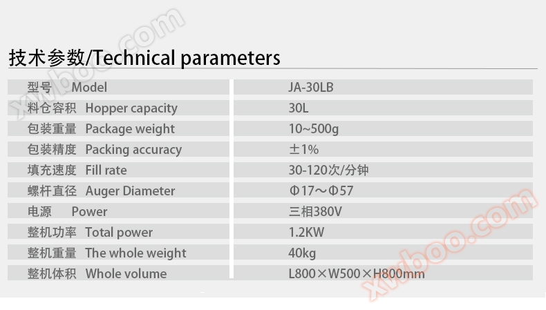 技術パラメータ/TechnicalparametersモデルModelJA-30 Lビン容積Hoppercapacity 30 L包装重量Packageweight 10 ~ 500 g包装精度Packingaccuracy 100 ~ 500 g<±1